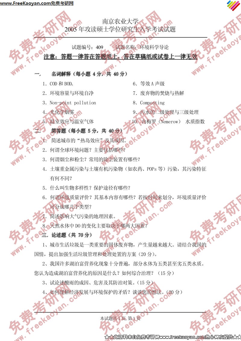 南京农业大学2005年半岛在线注册真题-环境科学导论