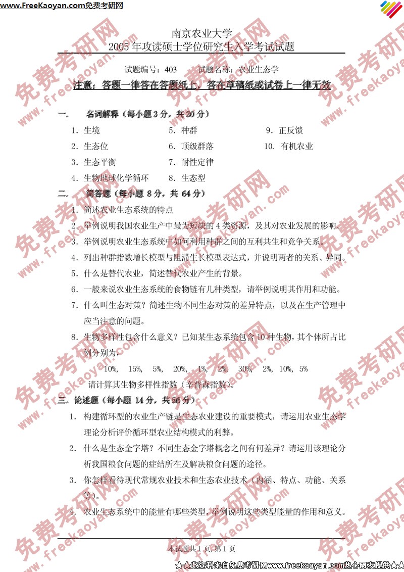 南京农业大学2005年半岛在线注册真题-农业生态学