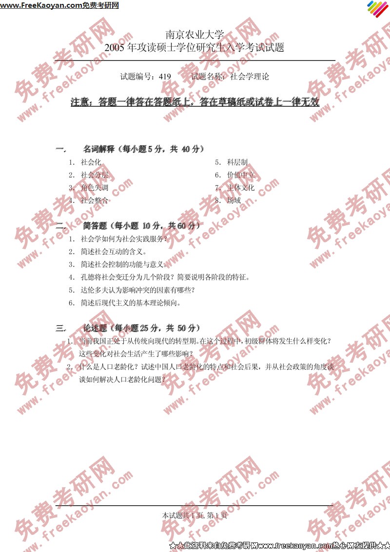 南京农业大学2005年半岛在线注册真题-社会学理论