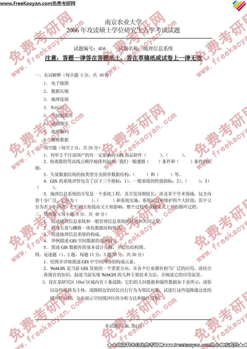 南京农业大学2006年半岛在线注册真题-地理信息系统