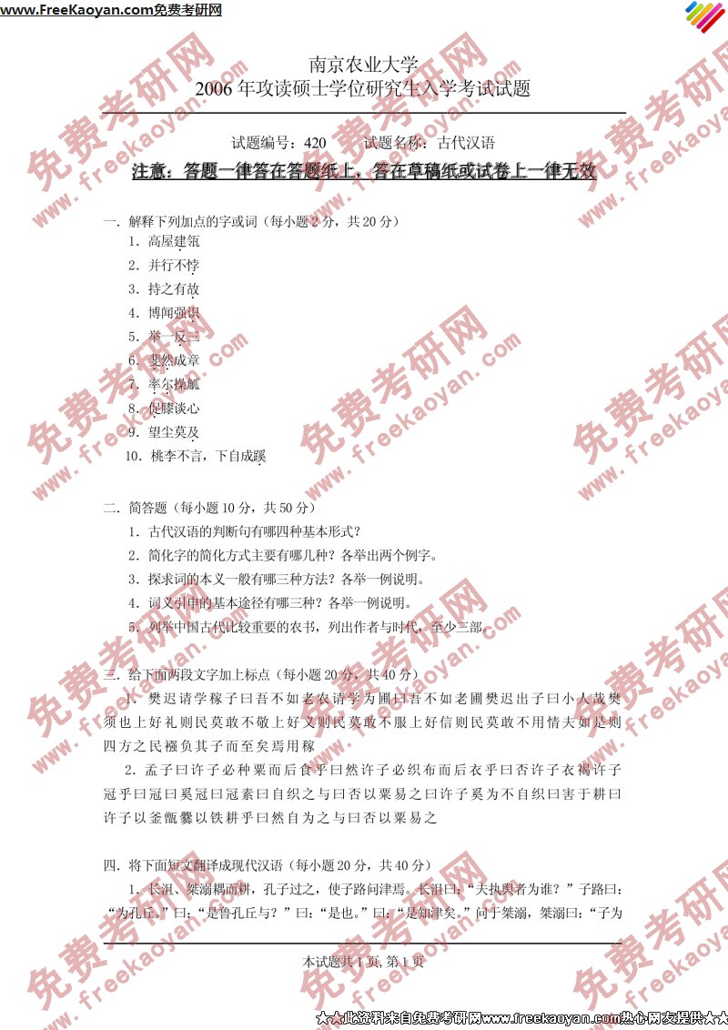 南京农业大学2006年半岛在线注册真题-古代汉语