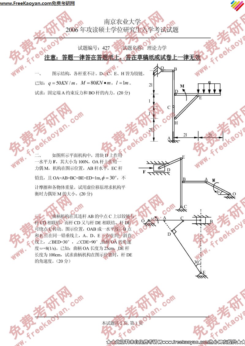 南京农业大学2006年半岛在线注册真题-理论力学