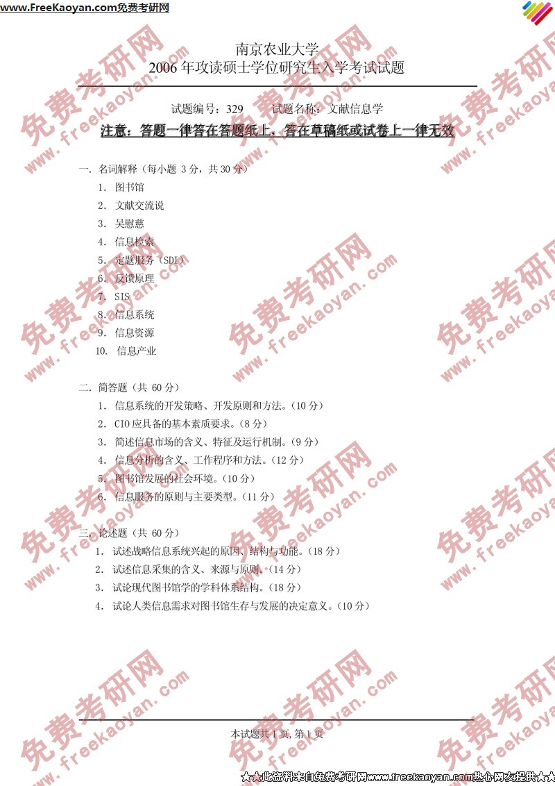 南京农业大学2006年半岛在线注册真题-文献信息学