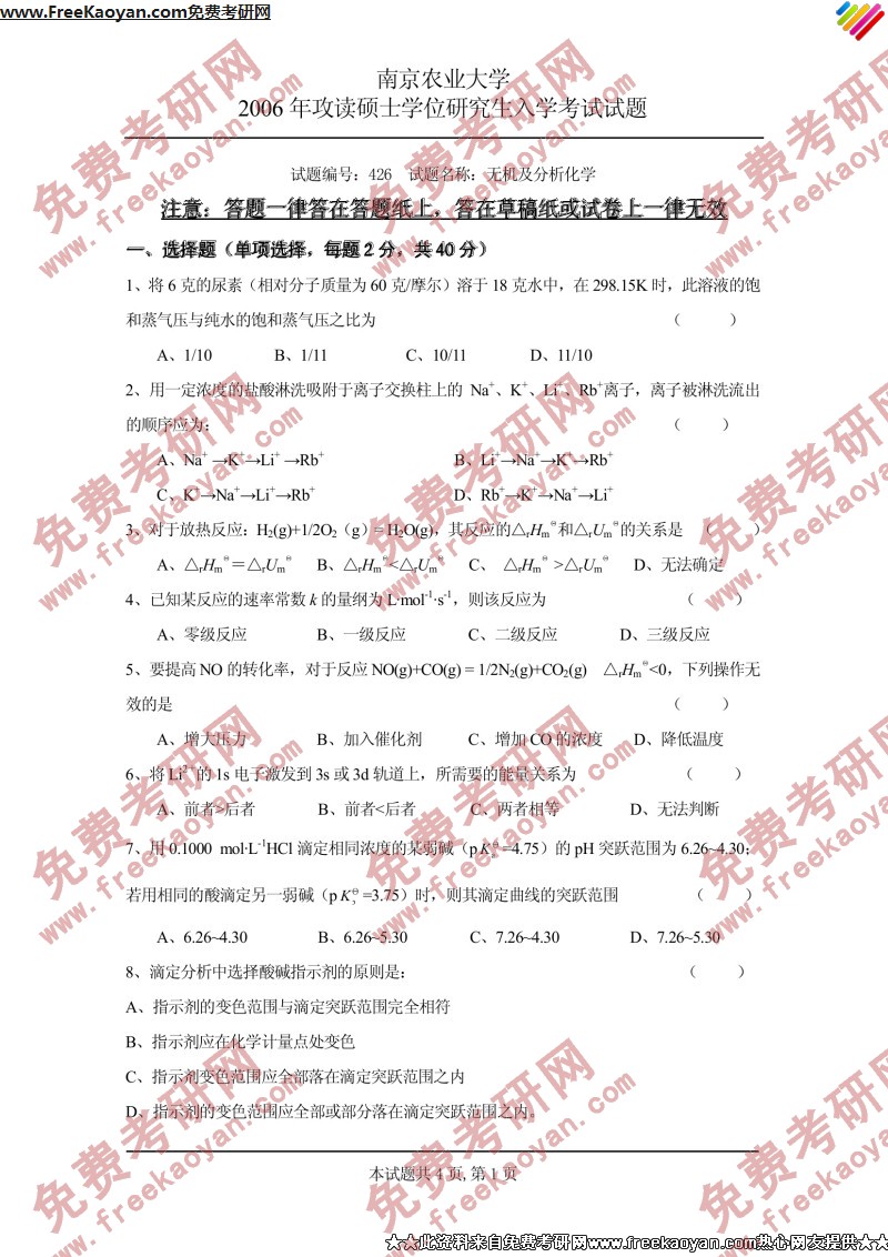 南京农业大学2006年半岛在线注册真题-无机及分析化学