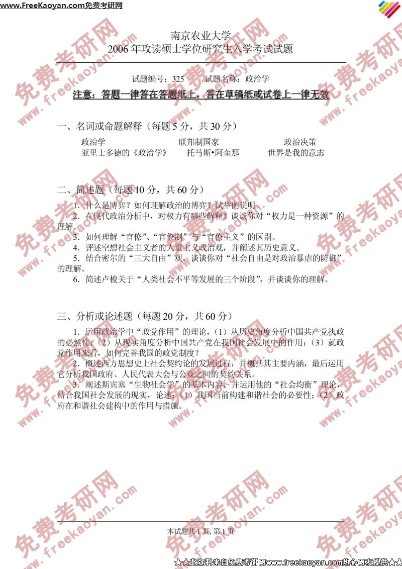 南京农业大学2006年半岛在线注册真题-政治学