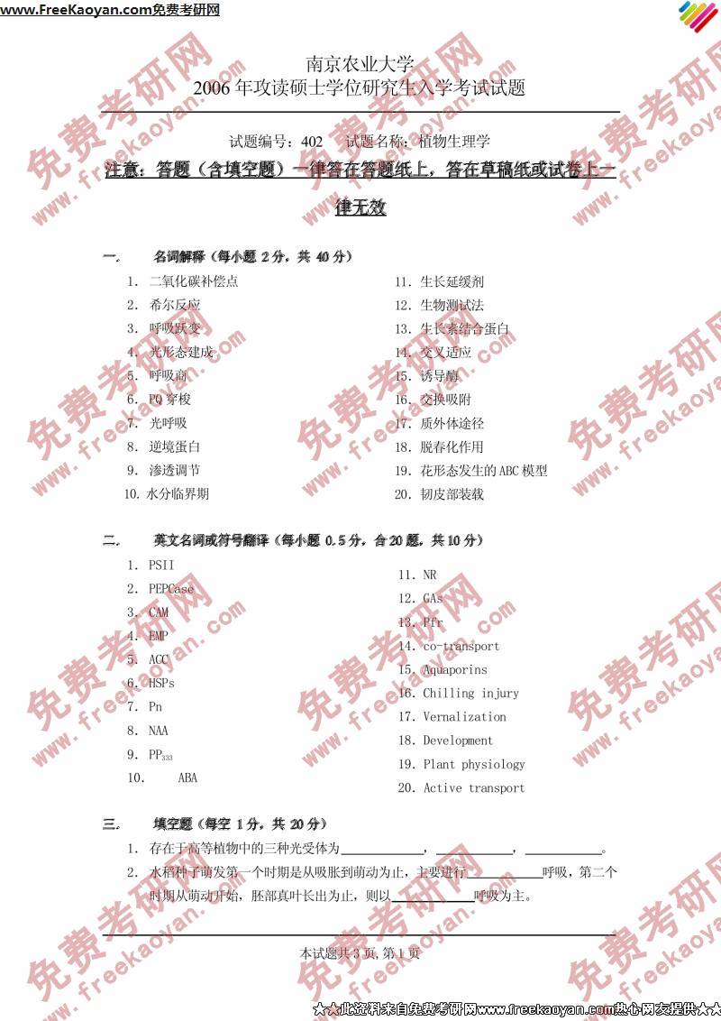 南京农业大学2006年半岛在线注册真题-植物生理学