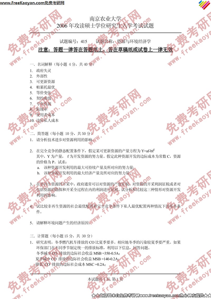 南京农业大学2006年半岛在线注册真题-资源与环境经济学