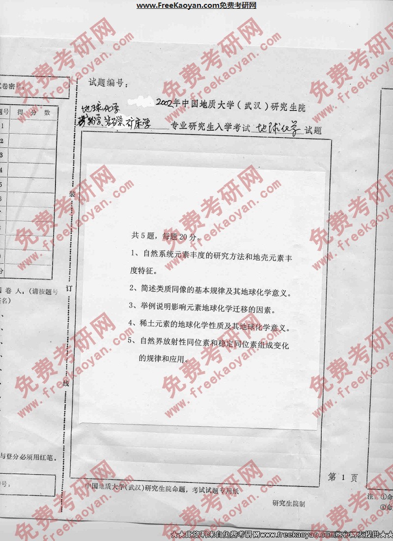 中国地质大学(武汉)2002年半岛在线注册真题-地球化学