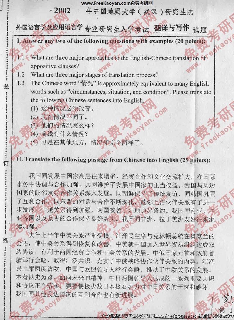 中国地质大学(武汉)2002年半岛在线注册真题-翻译与写作