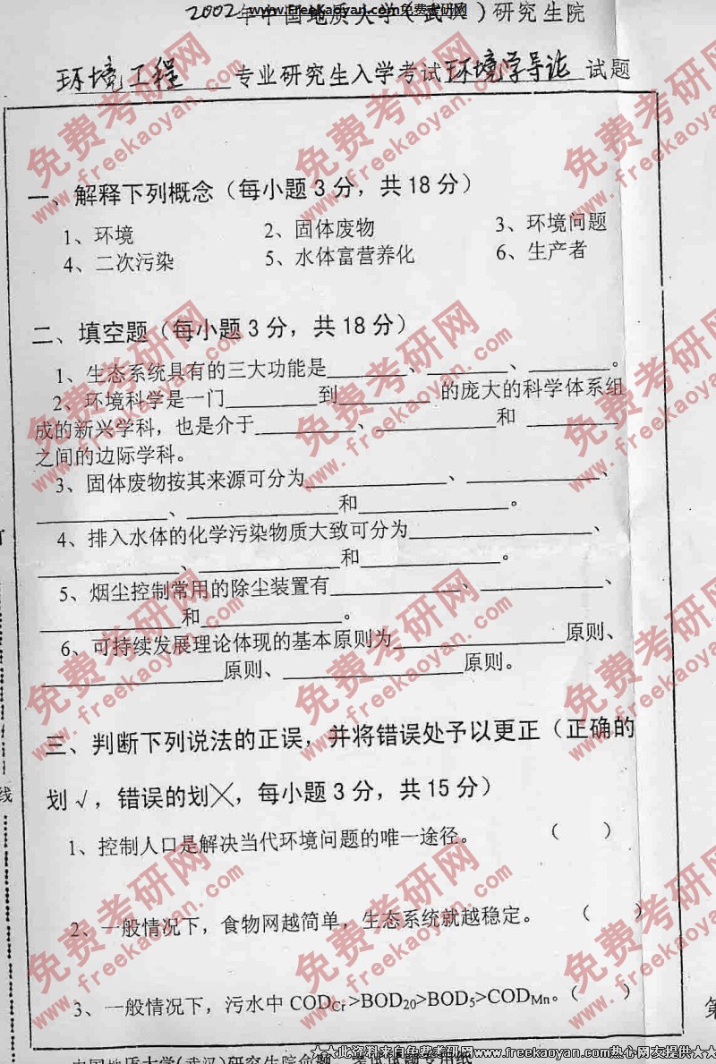 中国地质大学(武汉)2002年半岛在线注册真题-环境学概论