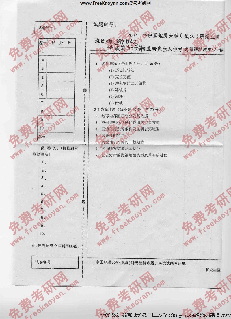 专业课半岛在线注册经验 本站小编 FreeKaoyan 2018-01-23中国地质大学(武汉)2002年半岛在线注册真题-古生物地史学