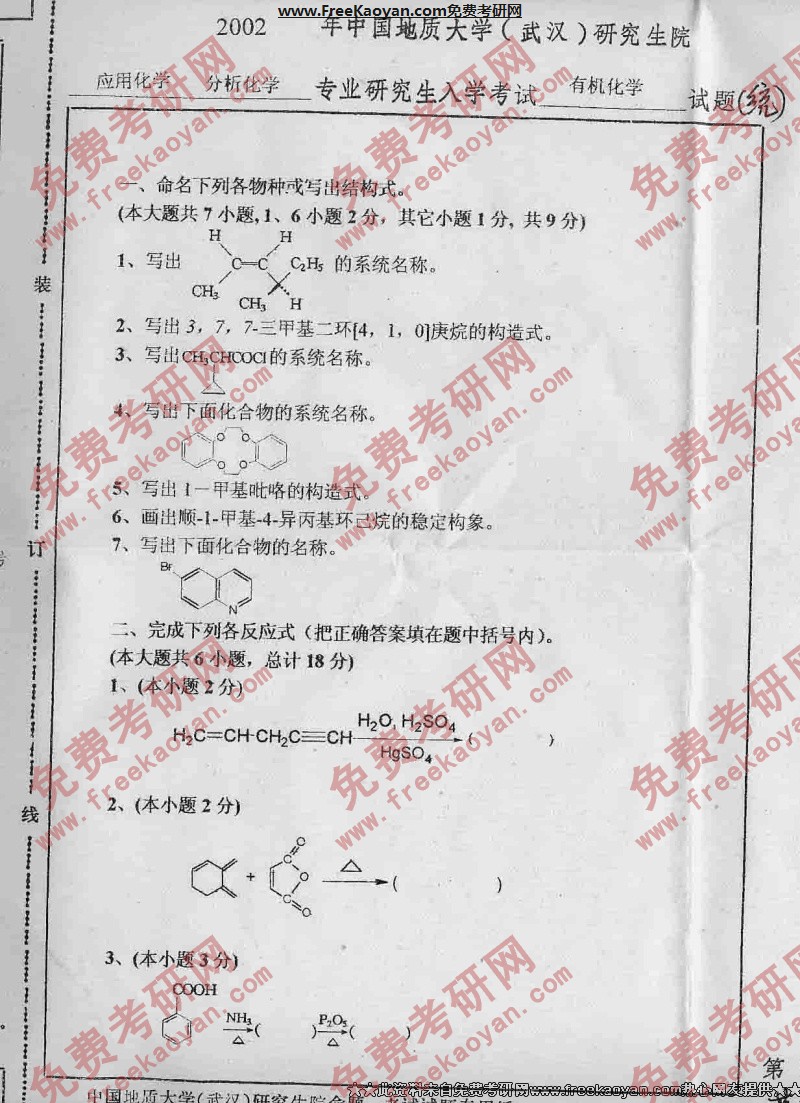 中国地质大学(武汉)2002年半岛在线注册真题-有机化学