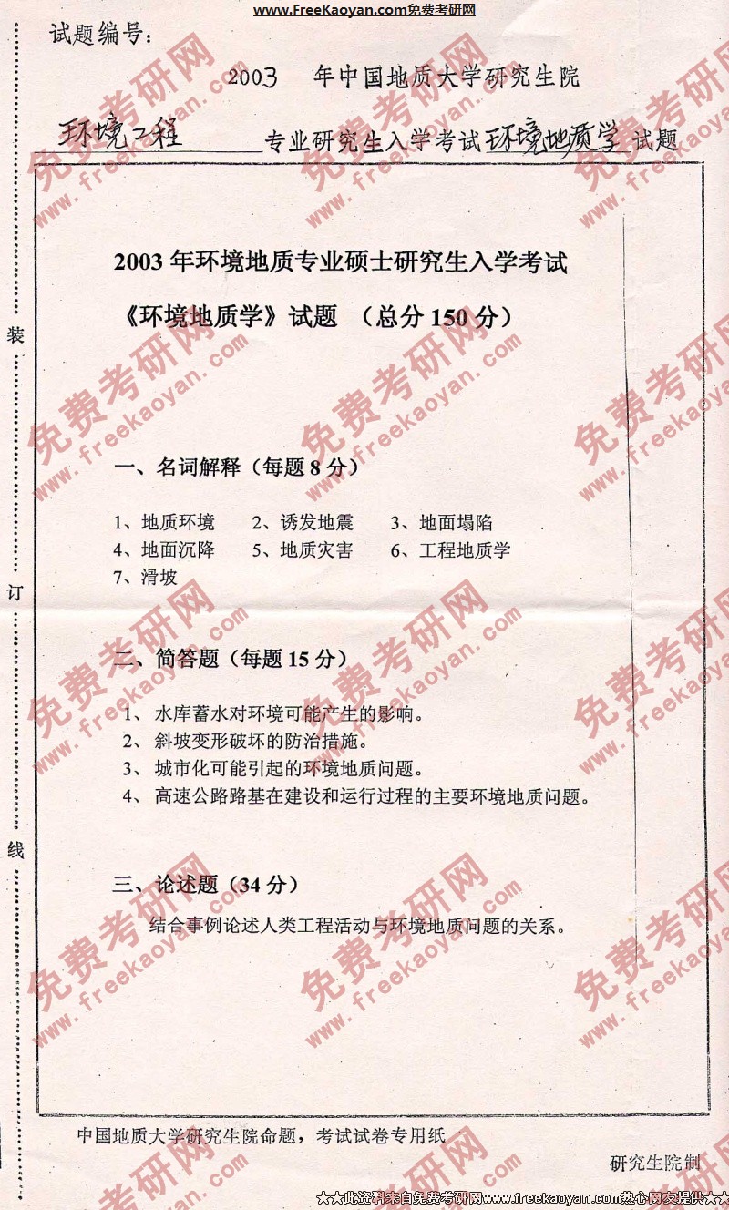 中国地质大学(武汉)2003年半岛在线注册真题-环境地质学