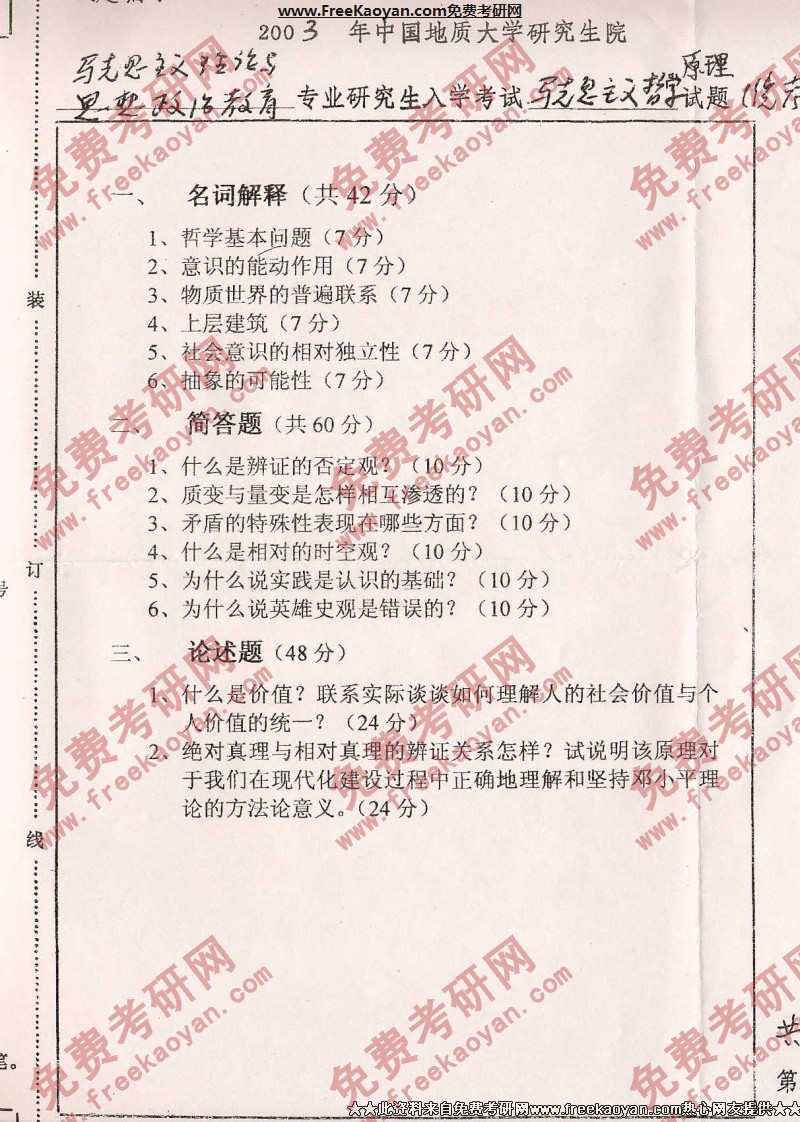 中国地质大学(武汉)2003年半岛在线注册真题-马克思主义哲学原理
