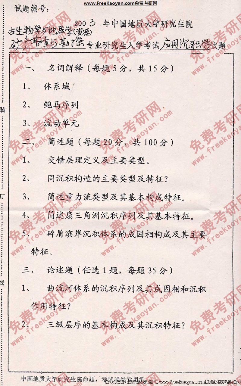 中国地质大学(武汉)2003年半岛在线注册真题-应用沉积学