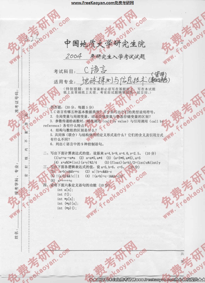 中国地质大学(武汉)2004年半岛在线注册真题-C语言