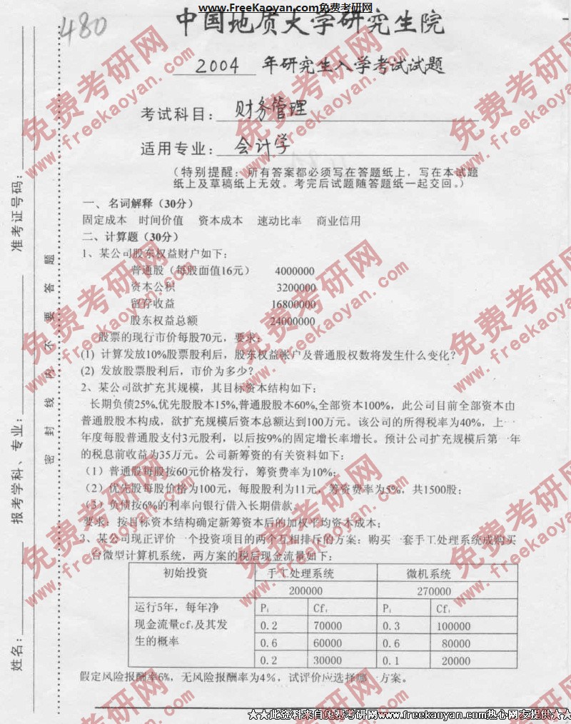 中国地质大学(武汉)2004年半岛在线注册真题-财务管理