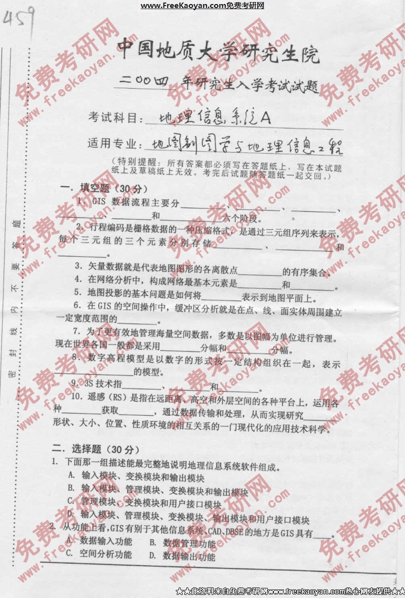中国地质大学(武汉)2004年半岛在线注册真题-地理信息系统A