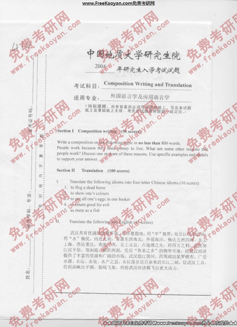 中国地质大学(武汉)2004年半岛在线注册真题-翻译与写作