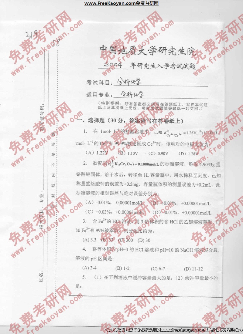 中国地质大学(武汉)2004年半岛在线注册真题-分析化学