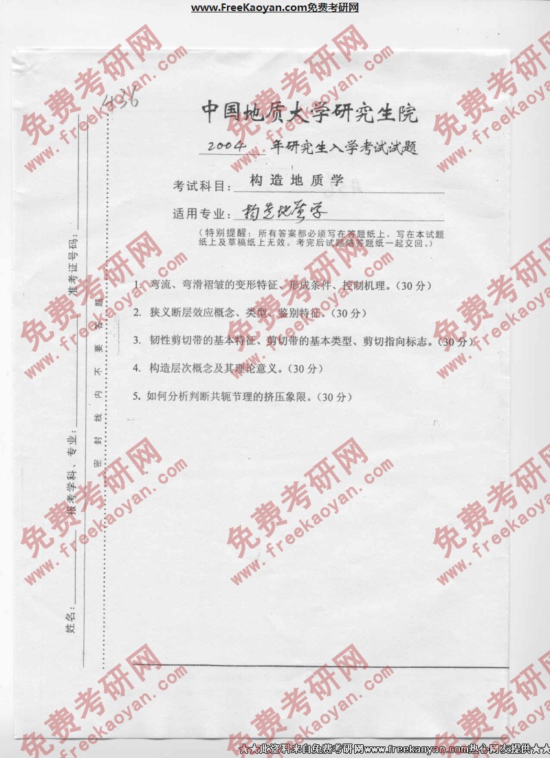 中国地质大学(武汉)2004年半岛在线注册真题-构造地质学