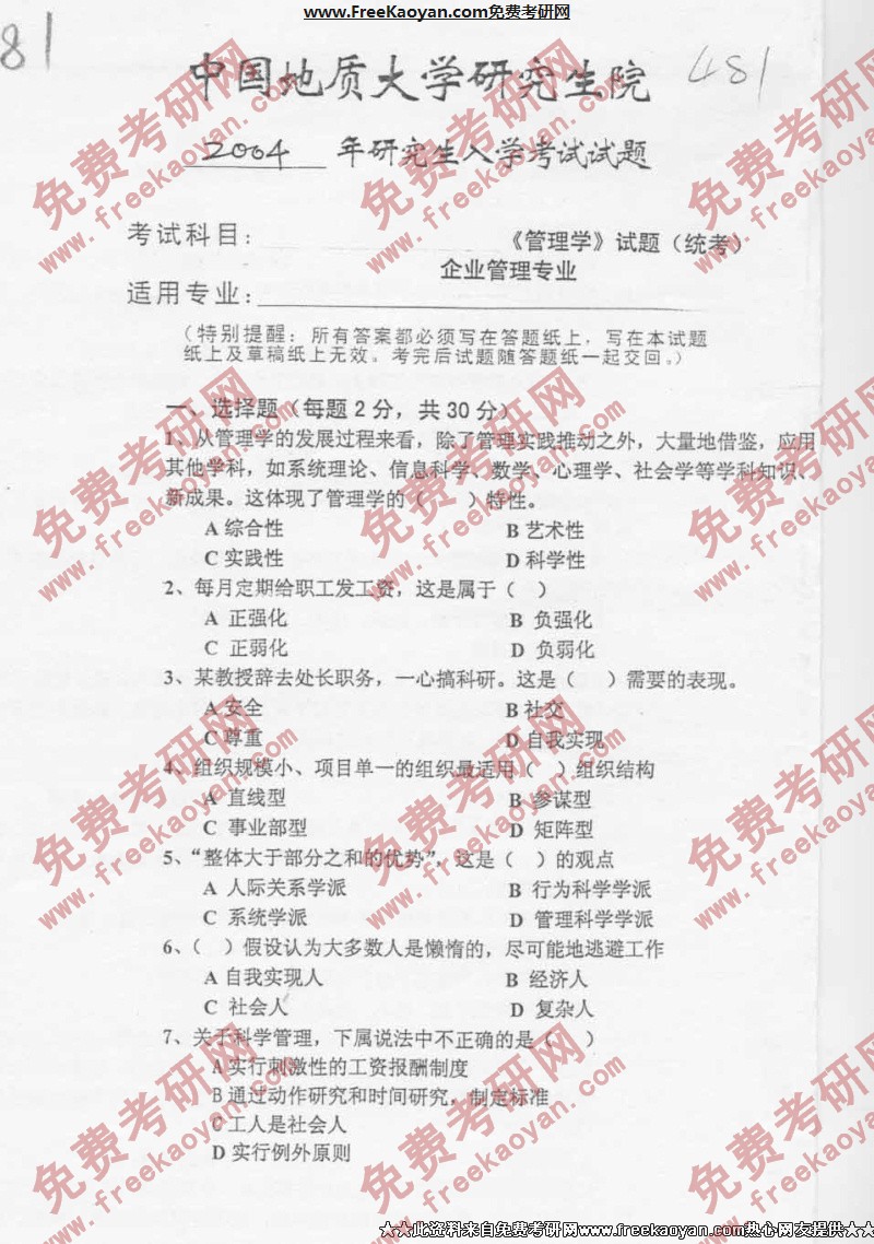 中国地质大学(武汉)2004年半岛在线注册真题-管理学