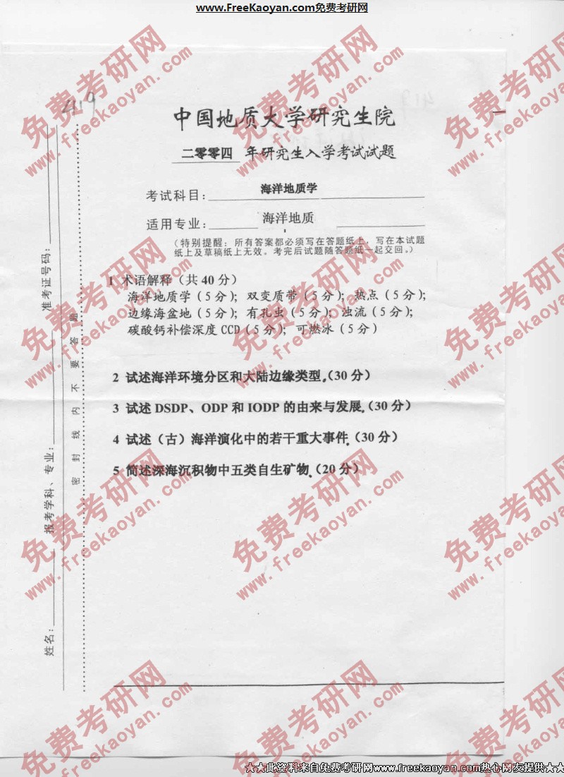 中国地质大学(武汉)2004年半岛在线注册真题-海洋地质学