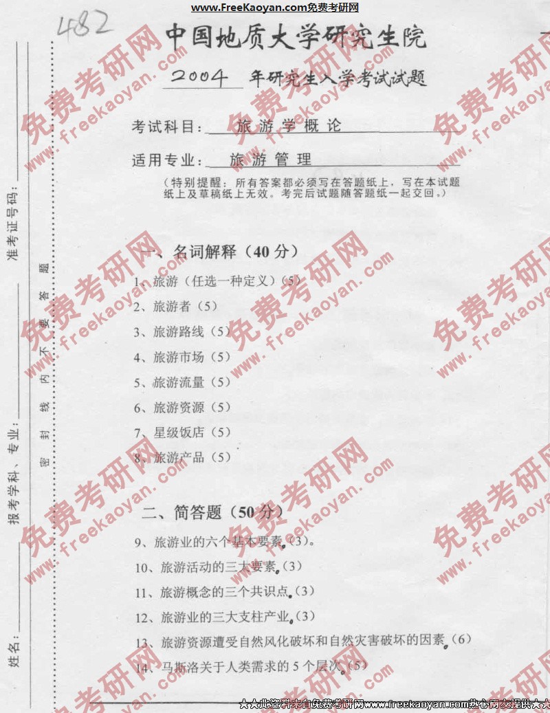 中国地质大学(武汉)2004年半岛在线注册真题-旅游学概论