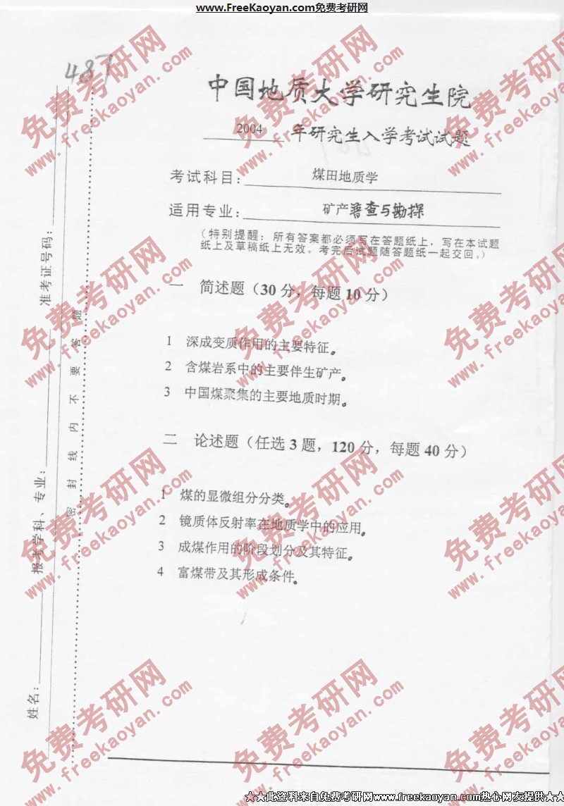 中国地质大学(武汉)2004年半岛在线注册真题-煤田地质