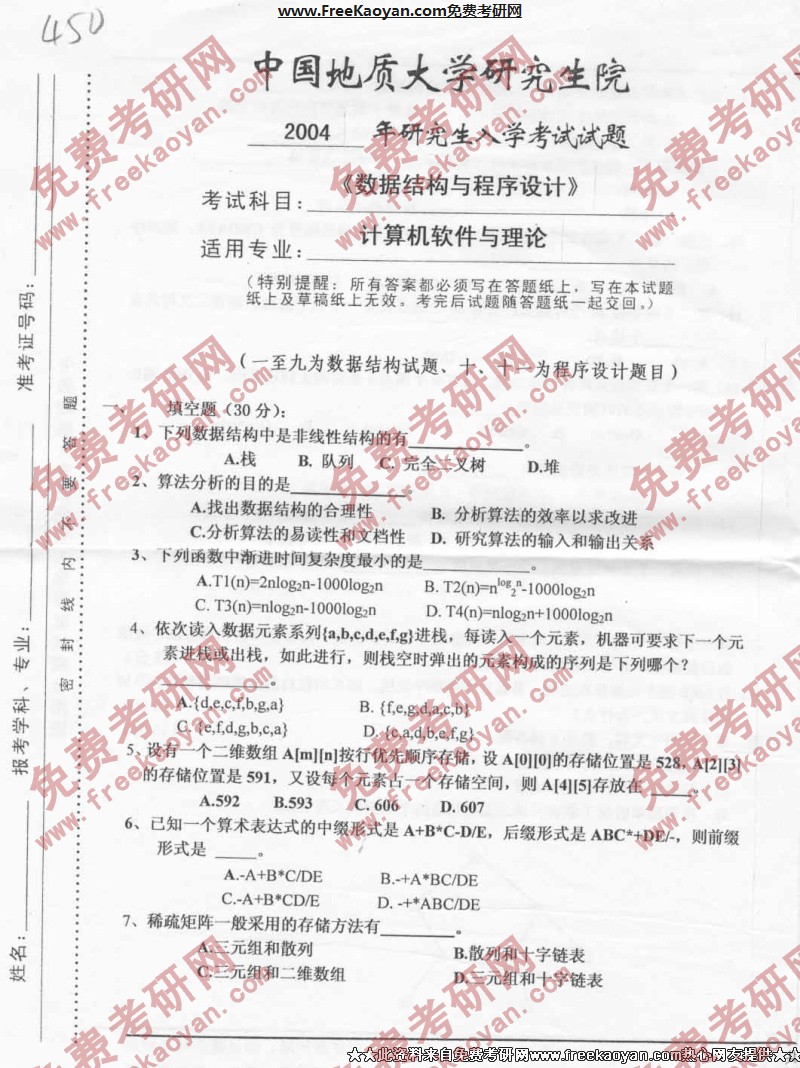 中国地质大学(武汉)2004年半岛在线注册真题-数据结构与程序设计