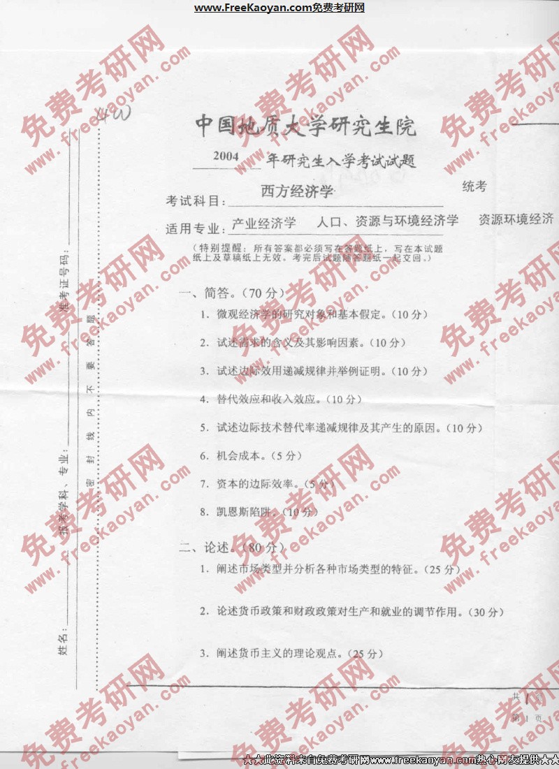 中国地质大学(武汉)2004年半岛在线注册真题-西方经济学