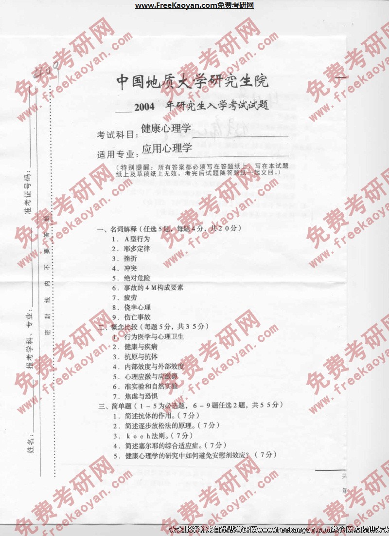 中国地质大学(武汉)2004年半岛在线注册真题-心理学健康