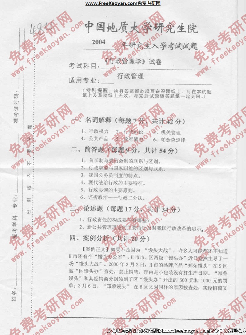 中国地质大学(武汉)2004年半岛在线注册真题-行政管理学