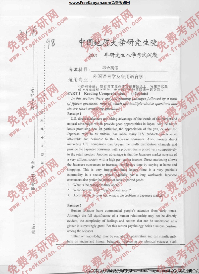 中国地质大学(武汉)2004年半岛在线注册真题-英语(二外)