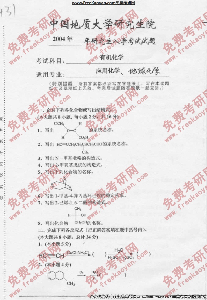 中国地质大学(武汉)2004年半岛在线注册真题-有机化学