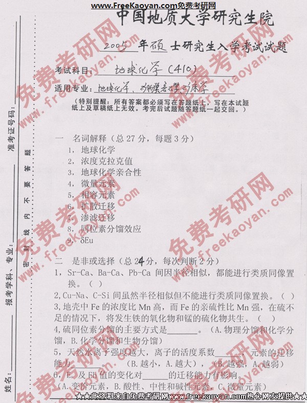 中国地质大学(武汉)2005年半岛在线注册真题-地球化学