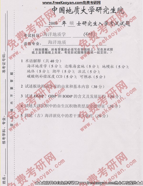 中国地质大学(武汉)2005年半岛在线注册真题-海洋地质学