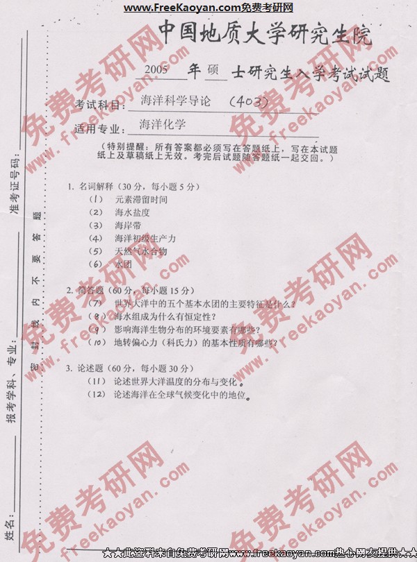 专业课半岛在线注册经验 本站小编 FreeKaoyan 2018-01-23中国地质大学(武汉)2005年半岛在线注册真题-海洋地质学