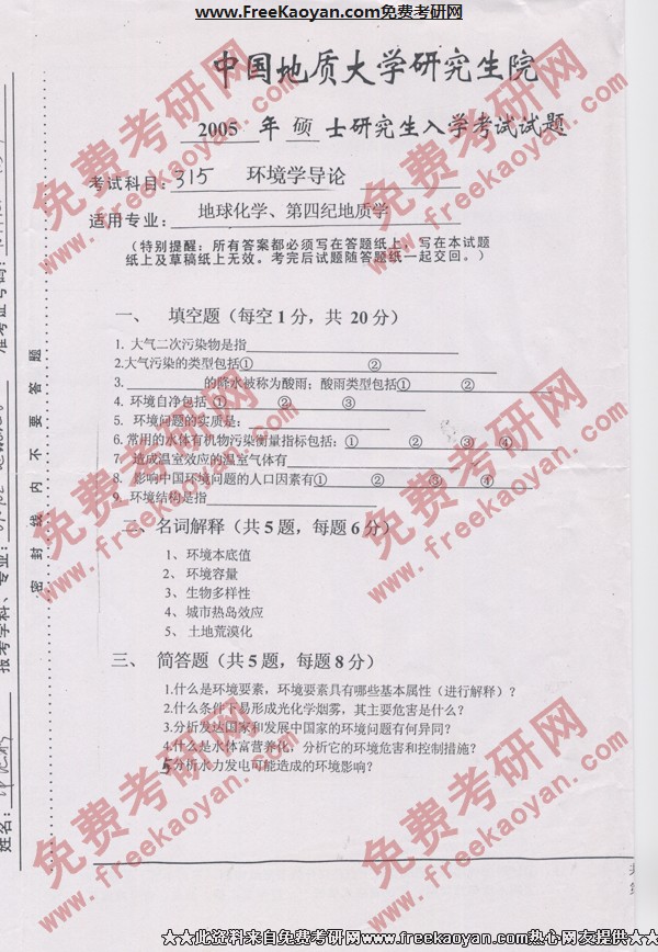 专业课半岛在线注册经验 本站小编 FreeKaoyan 2018-01-23中国地质大学(武汉)2005年半岛在线注册真题-环境地质学