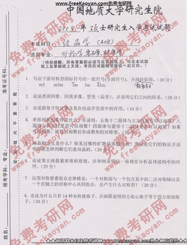 中国地质大学(武汉)2005年半岛在线注册真题-结晶学