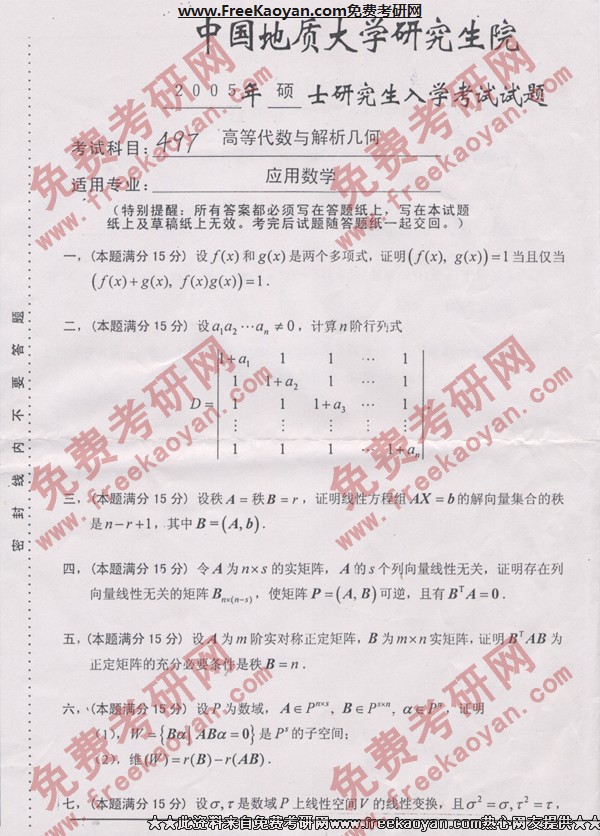 中国地质大学(武汉)2005年半岛在线注册真题-解析几何与高等代数