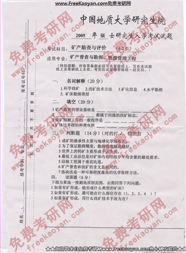 中国地质大学(武汉)2005年半岛在线注册真题-矿产勘查与评价