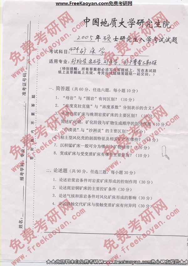 中国地质大学(武汉)2005年半岛在线注册真题-矿床学