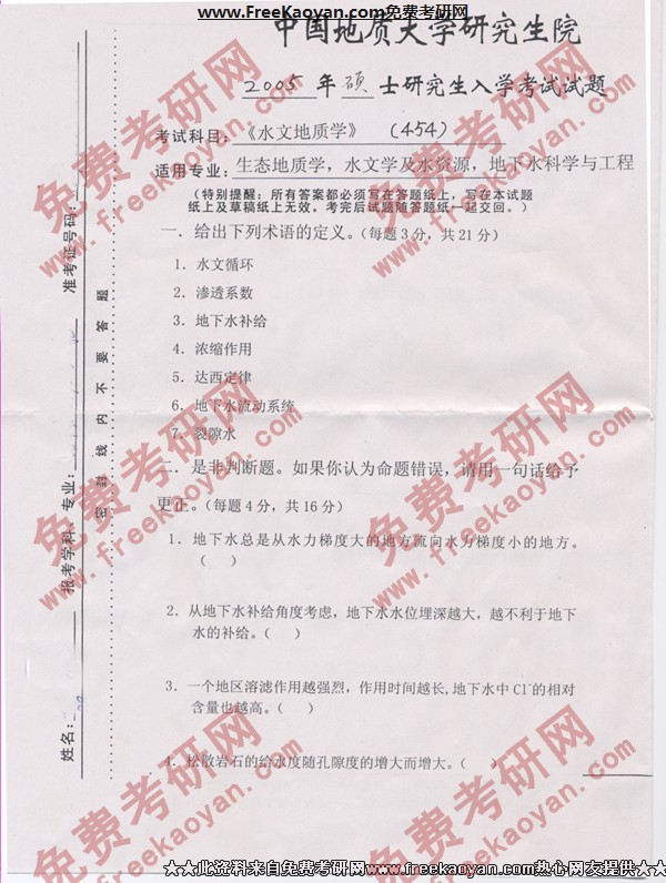 中国地质大学(武汉)2005年半岛在线注册真题-水文地质学