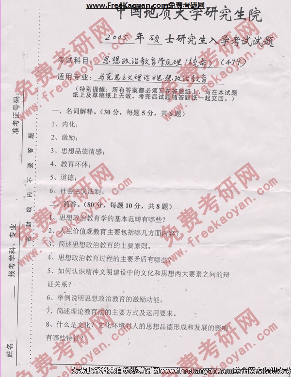 中国地质大学(武汉)2005年半岛在线注册真题-思想政治教育学原理