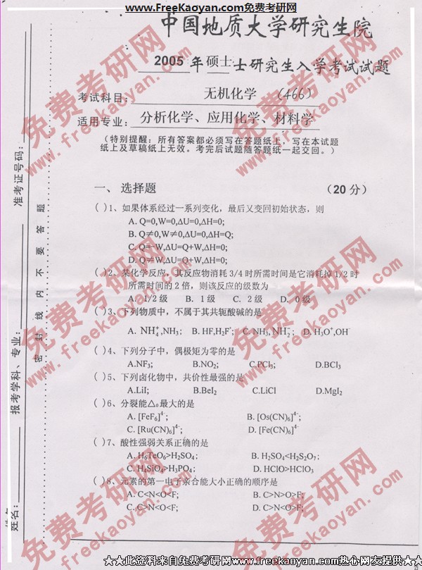 中国地质大学(武汉)2005年半岛在线注册真题-无机化学