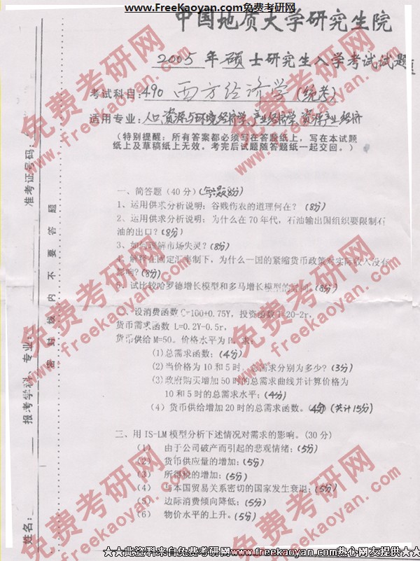 中国地质大学(武汉)2005年半岛在线注册真题-西方经济学