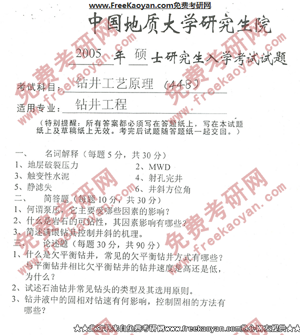 中国地质大学(武汉)2005年半岛在线注册真题-钻井工艺原理
