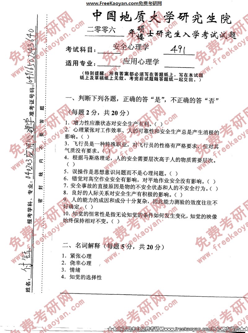 中国地质大学(武汉)2006年半岛在线注册真题-安全心理学
