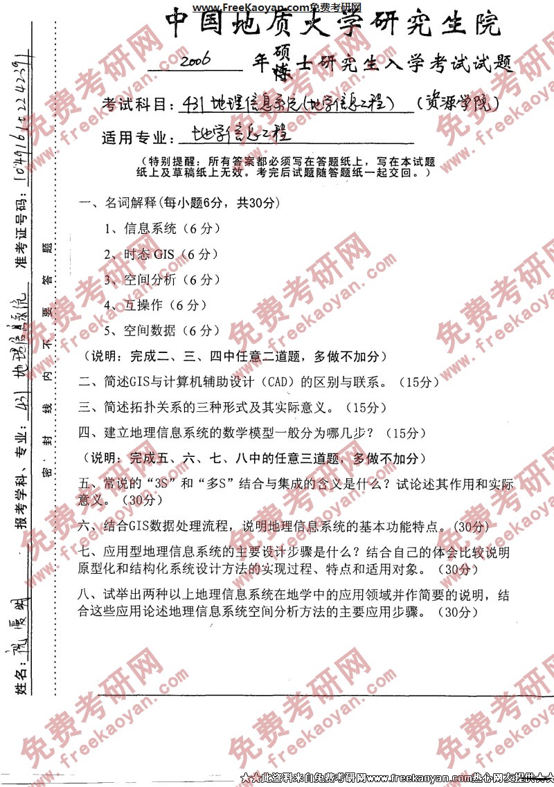 中国地质大学(武汉)2006年半岛在线注册真题-地理信息系统